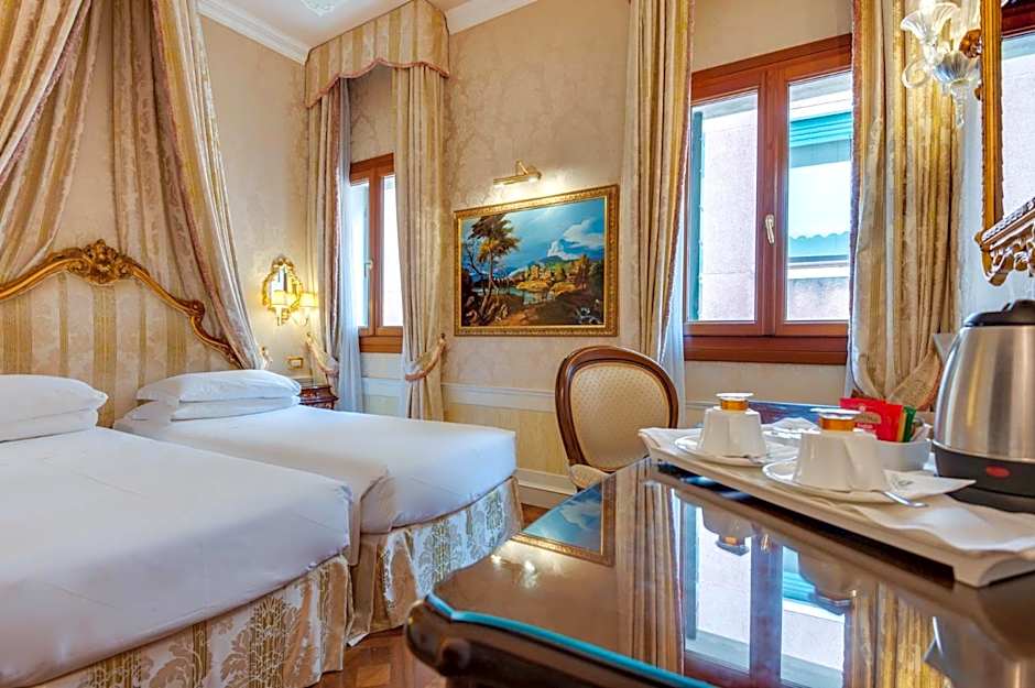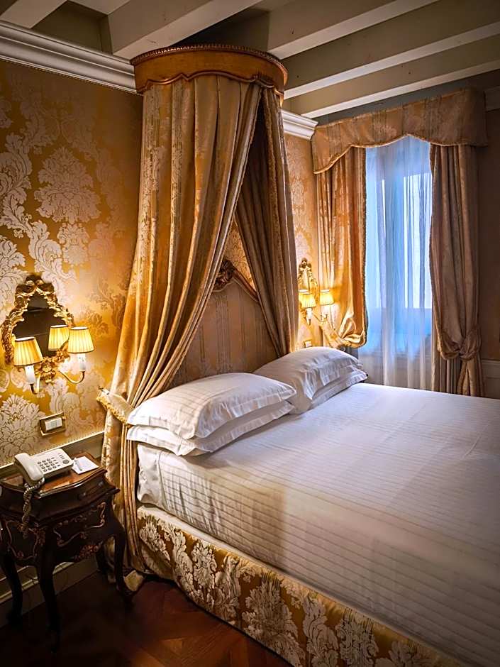 Overlooking a characteristic Venetian street, this room is located in the hotel main building. It comes with Murano glass elements, fine fabrics and Venetian-style décor.